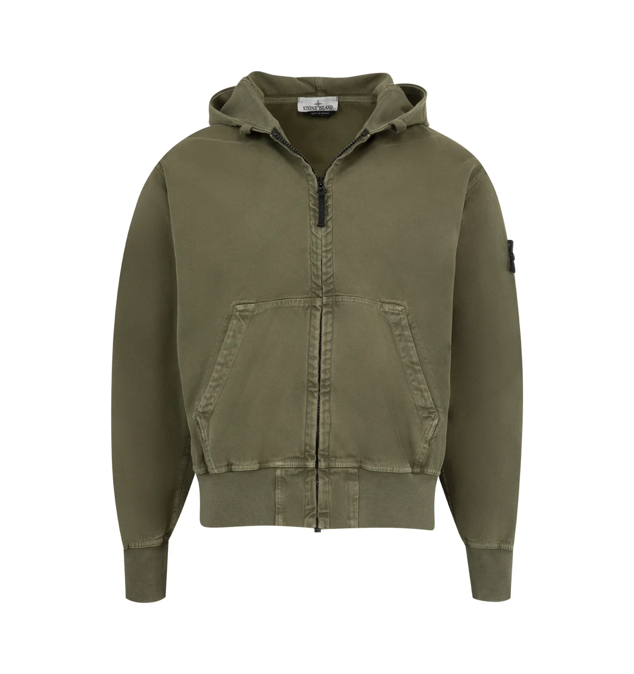 STONE ISLAND Hoodie Sweater featuring hood with ribbed cotton lining around contour, fixed drawstring, ribbed cotton inserts at shoulders, under armholes, and on sides, hand patch pockets with slanted entrance, Stone Island badge on left sleeve, ribbed cotton cuffs and bottom band and oversized fit. 100% cotton. DESIGNER STYLE ID: 6100017-S0184 COLOR: V0154 MILITARY GREEN