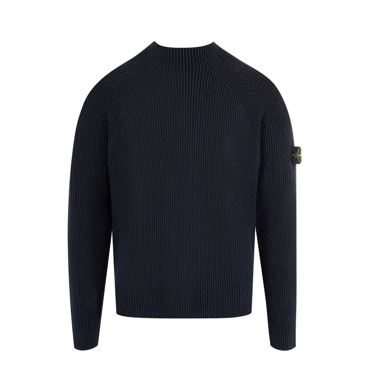 STONE ISLAND Mock Neck Sweater featuring stitching along neckline, raglan sleeves, Stone Island badge on left sleeve, plain hem on cuffs and bottom and loose fit. 57% virgin wool, 35% cotton, 7% polyamide/nylon, 1% elastane/spandex. DESIGNER STYLE ID: 5100023-S00L7 COLOR: V0020 NAVY BLUE