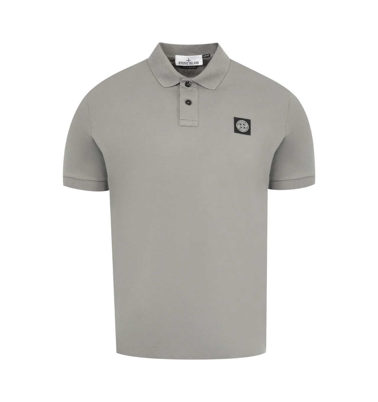 STONE ISLAND Polo Shirt featuring ribbed collar with two-button fastening, Stone Island Compass logo patch on chest, ribbed sleeve edge, bottom side slits with inner striped tape trim and slim fit. 95% cotton, 5% elastane/spandex. DESIGNER STYLE ID: 2200005-S0017 COLOR: V006B CEMENT