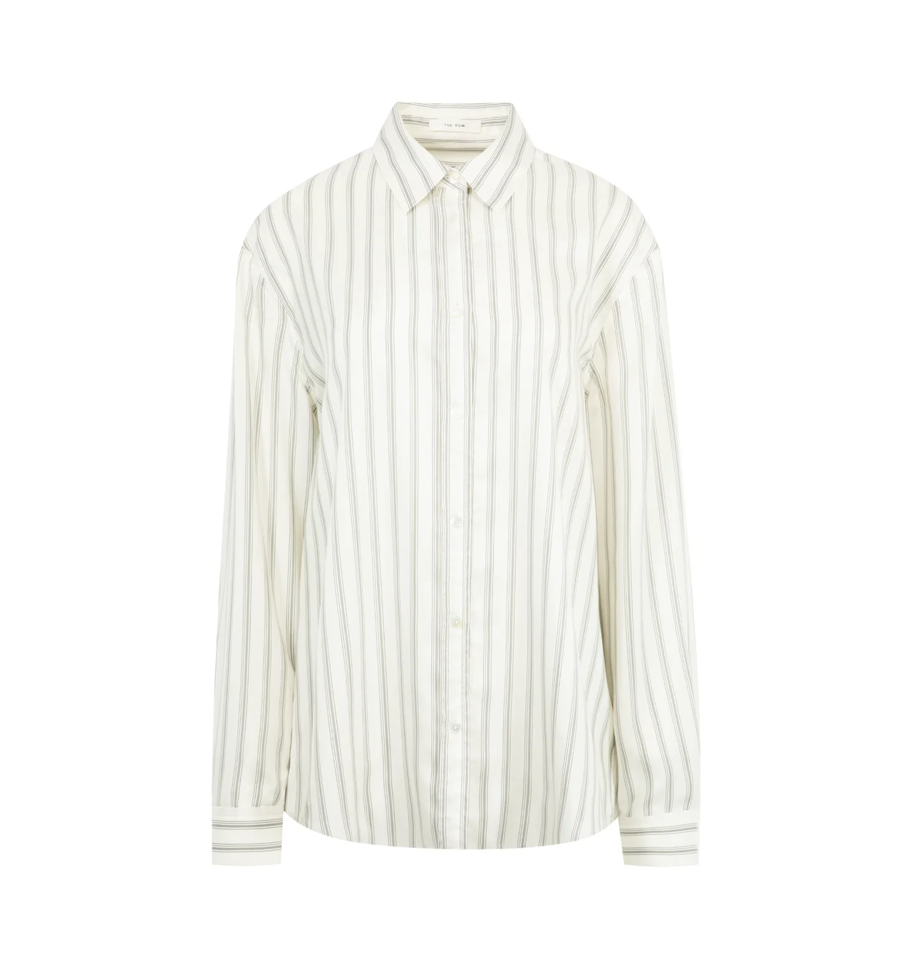 The Row Classic button-up shirt in striped silk poplin with slightly curved hem, center back box pleat, and exposed front placket with mother-of-pearl buttons. 100% Silk. Made in Italy. DESIGNER STYLE ID: 10170-W4189 COLOR: GREY STRIPE