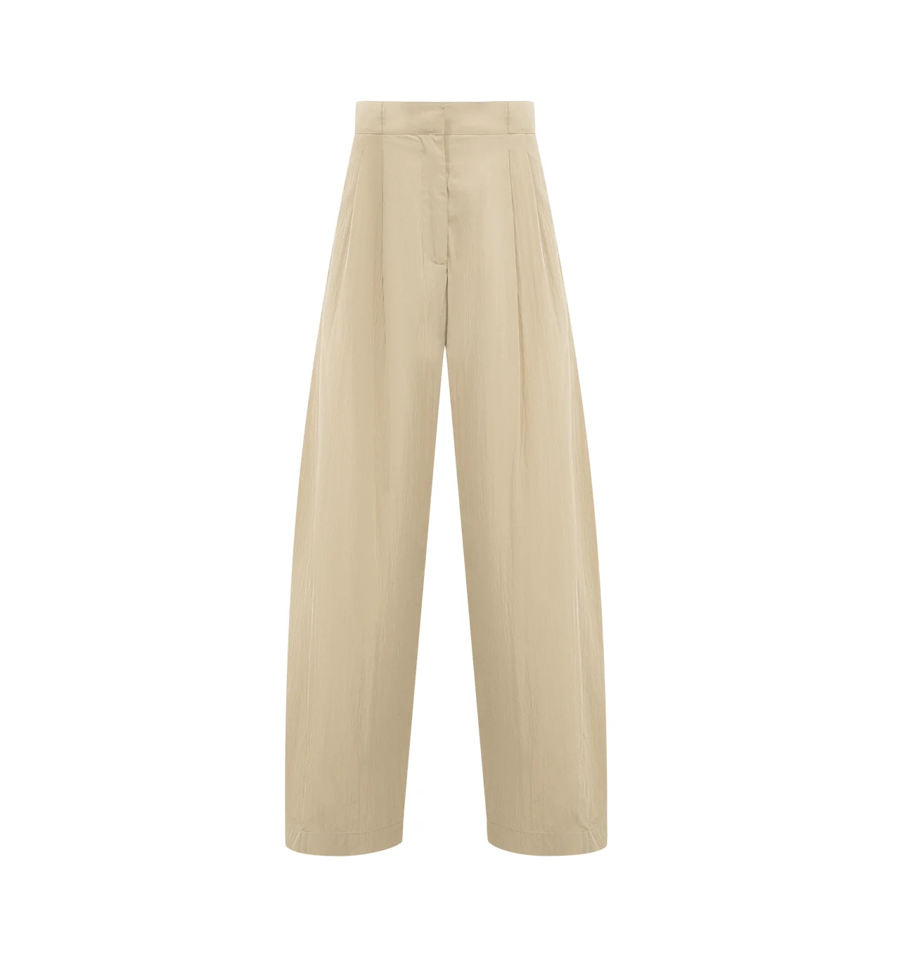 THE ROW Iven Pant featuring tailored low-rise pant in softly crinkled technical silk with barrel leg, front double pleats, adjustable back button tabs and side welt pockets. 65% silk, 35% nylon. Made in Italy. DESIGNER STYLE ID: 10831-W4403 COLOR: BEIGE