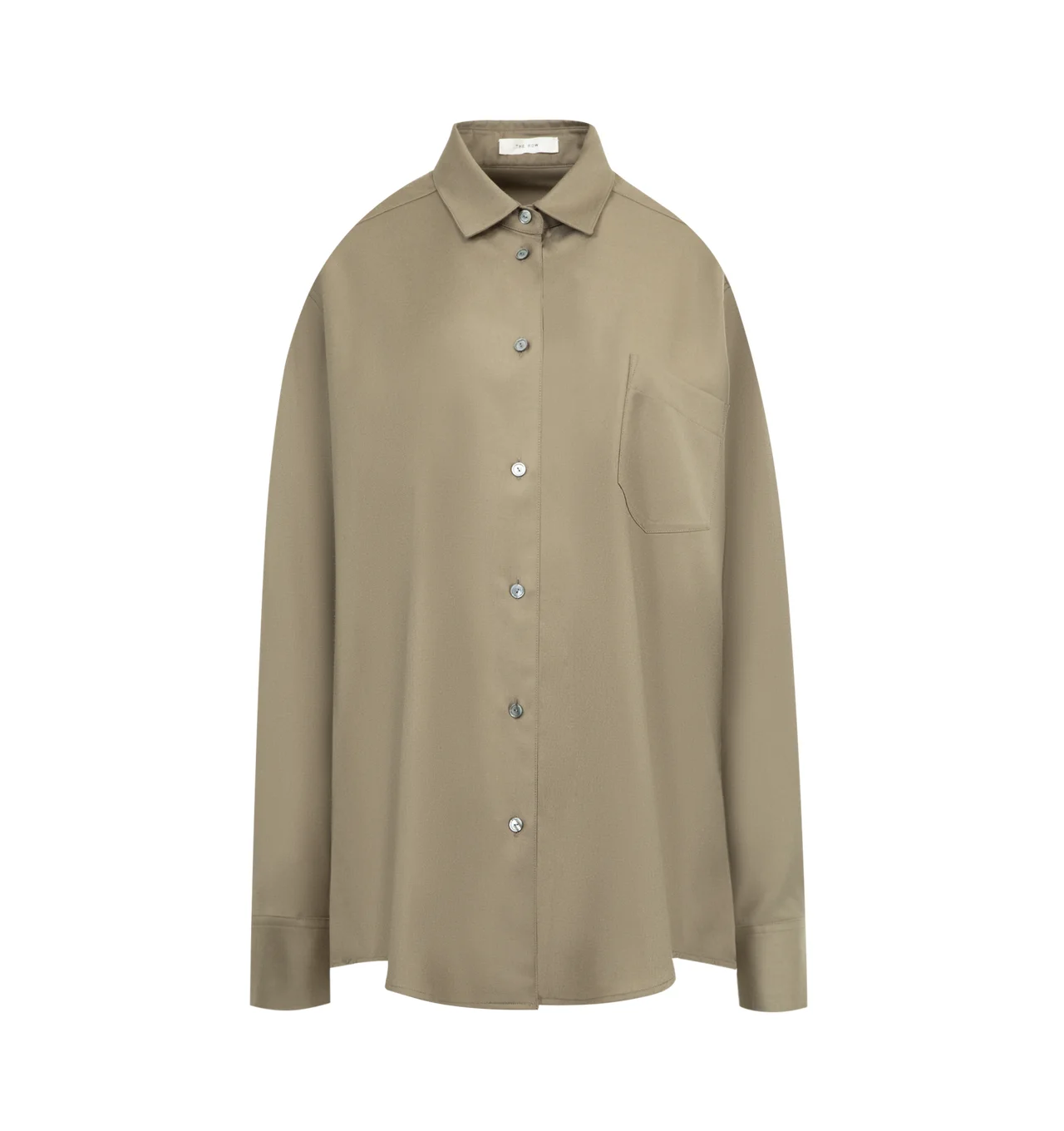 THE ROW Pino Shirt featuring oversized button-up shirt in virgin wool flannel with front patch pocket and exposed front placket with mother-of-pearl buttons. 100% wool. Lined in 100% silk. Made in Italy. DESIGNER STYLE ID: 10275-W4084 COLOR: MILITARY BEIGE