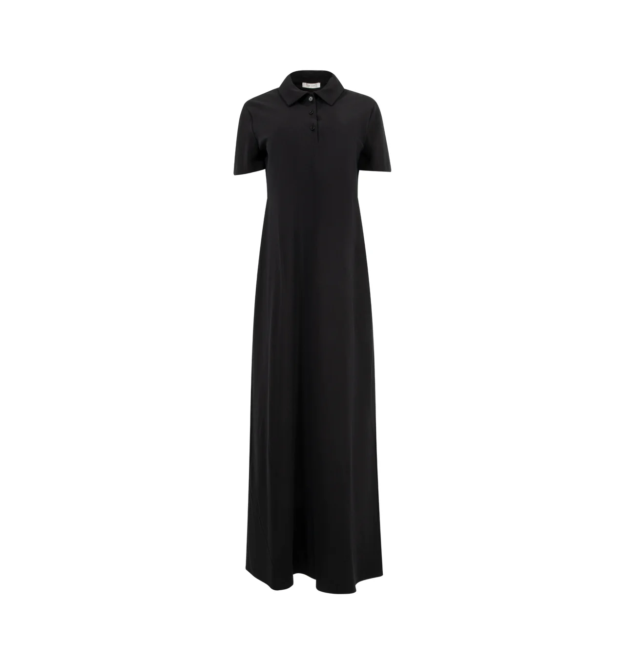 THE ROW Valenit Dress featuring collar with 3 button placket, short sleeves and maxi length. 55% cupro, 44% silk. Lining: 100% silk. Made in Italy. DESIGNER STYLE ID: 9064-W3848 COLOR: BLACK