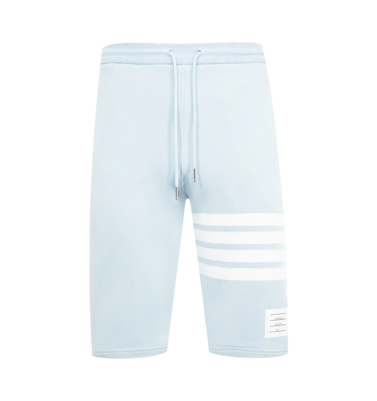 THOM BROWNE Classic Loopback 4-Bar Sweatshorts featuring drawstring waistband with silver tone aglets, engineered 4-bar stripe detail at left thigh, name tag applique above left cuff, slip side pockets, single back welt pocket and signature striped grosgrain loop tab at back waist. 100% cotton. Made in Japan. DESIGNER STYLE ID: MJQ012H-00535 COLOR: 480 LIGHT BLUE