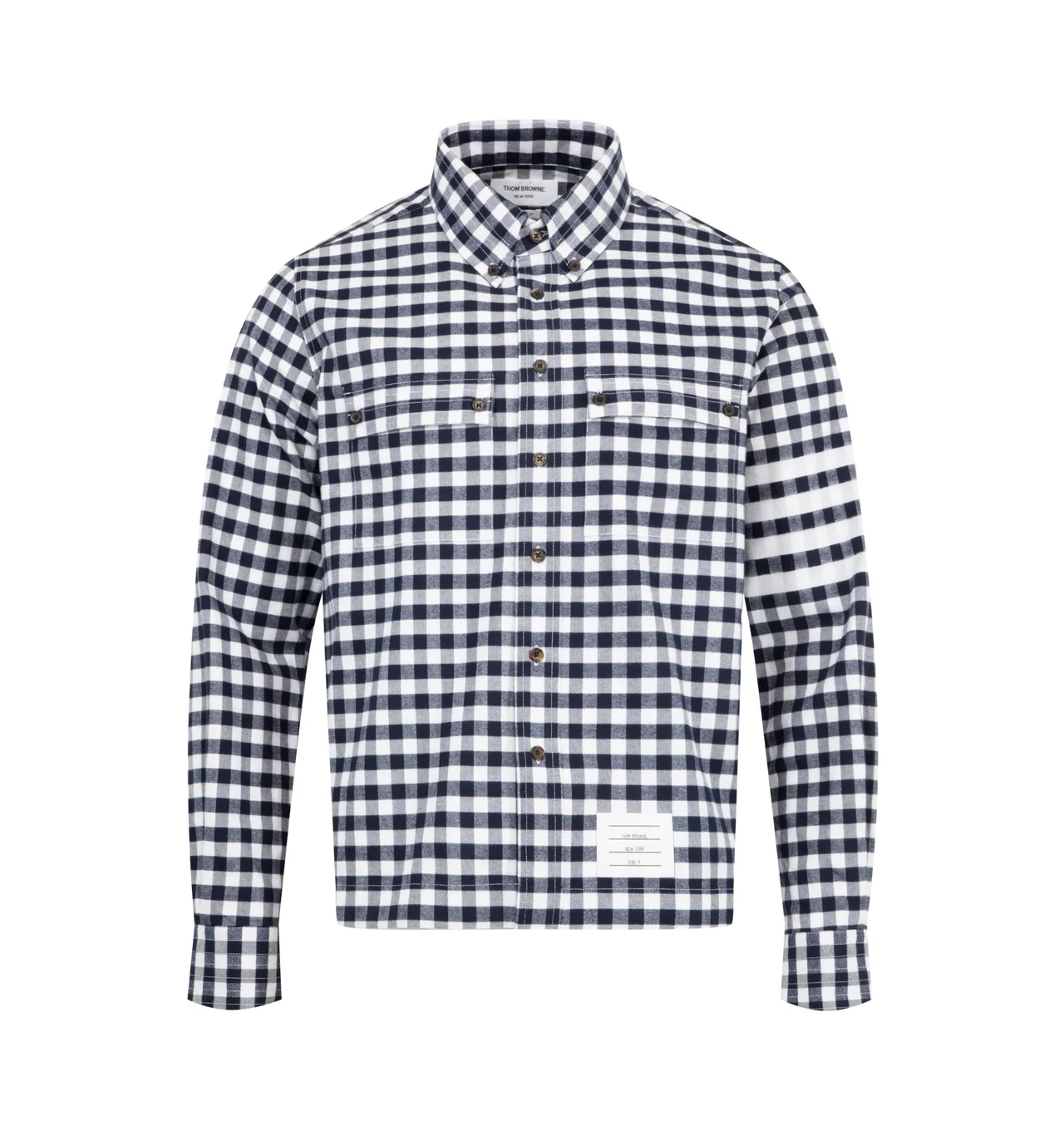 THOM BROWNE Gingham Flannel Shirt featuring front button closure, 4-bar detailing, name tag applique, 2 chest flap pockets with button fastening, pleated back yoke with locker loop and signature striped grosgrain loop tab. 100% cotton. Made in Italy. DESIGNER STYLE ID: MWL417A-F0945 COLOR: 415 NAVY