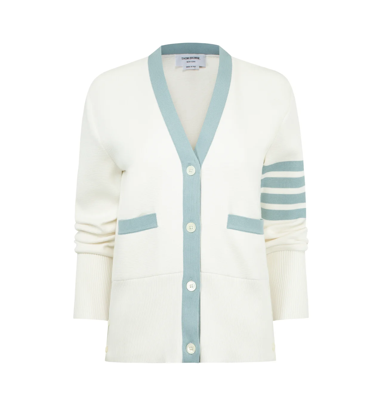 THOM BROWNE Milano Classic 4-Bar Stripe Cotton V-Neck Cardigan featuring V-neck, long sleeves, contrast trim, rib-knit cuffs, side slip pockets, rib-knit hem and button-front placket. 100% cotton. Made in Italy. DESIGNER STYLE ID: KC207B-00219 COLOR: 117 WHITE