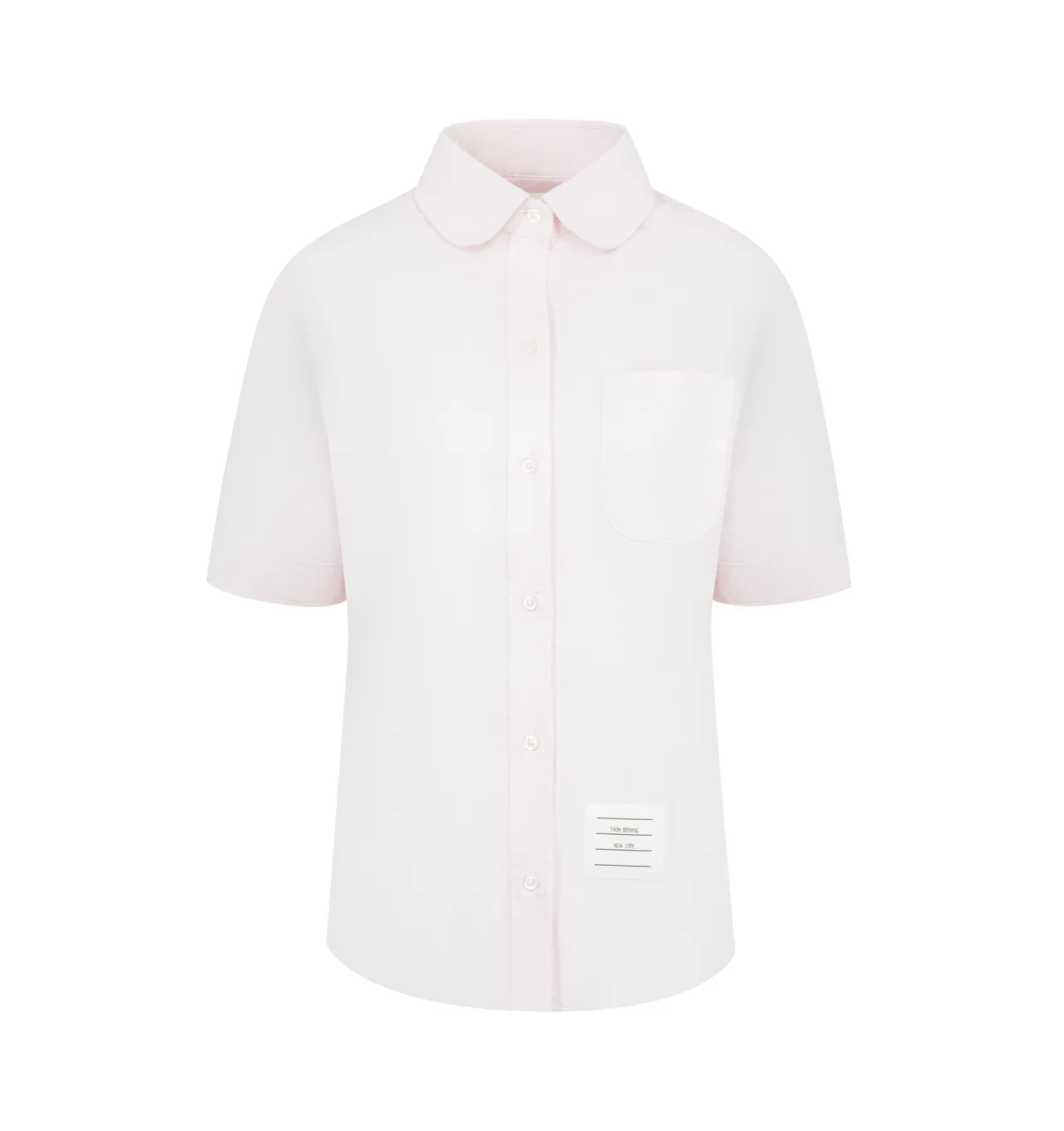 THOM BROWNE Round Collar Oxford Short Sleeve Shirt featuring front button closure, front patch pocket, name tag applique above hem, pleated back yoke with locker loop and signature striped grosgrain loop tab. 100% cotton. Made in Italy. DESIGNER STYLE ID: FLL206A-F0313 COLOR: 680 LT PINK
