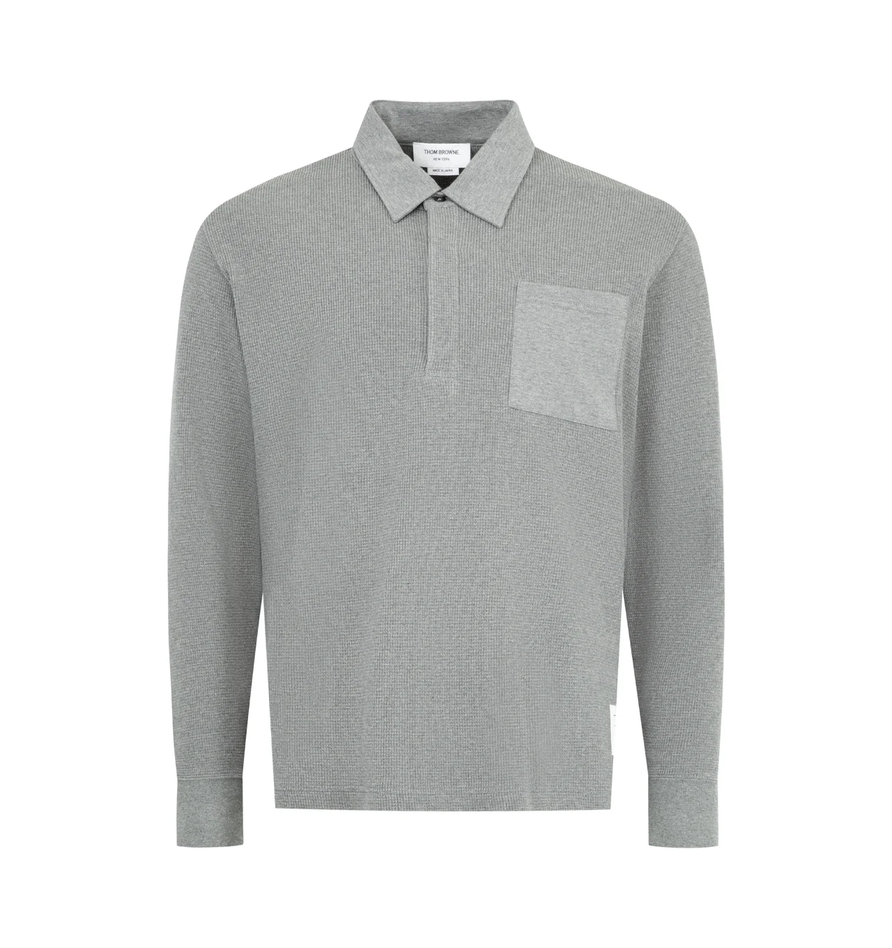 THOM BROWNE Waffle-Texture Rugby Polo Shirt featuring waffle knit cotton, signature name tag applique, point collar, concealed half placket, contrast chest pocket, ribbed cuffs, vented sides with striped grosgrain trim and pullover style. Cotton. Made in Japan. DESIGNER STYLE ID: MJP233A-J0114 COLOR: 035 MED GREY