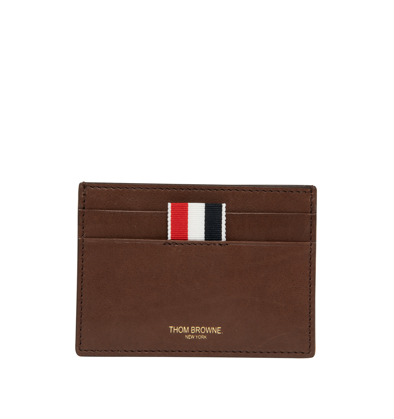 THOM BROWNE Single Card Holder in soft calf featuring 2 card slots, 1 note compartment, tricolor stripe lining, gold foil logo and signature striped grosgrain loop tab. 100% calf full grain leather. Made in Italy. DESIGNER STYLE ID: MAW020L-L0117 COLOR: 205 DARK BROWN