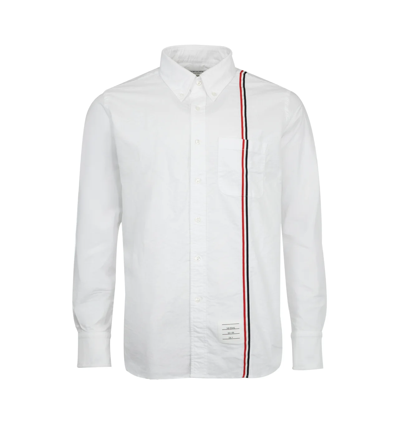 THOM BROWNE Straight Fit Button Down featuring grosgrain ribbon trim, RWB stripe, button-down collar, front button fastening, chest patch pocket, long sleeves, buttoned cuffs and curved hem. 100% cotton. Made in Italy. DESIGNER STYLE ID: MWL396A-F0313 COLOR: 100 WHITE