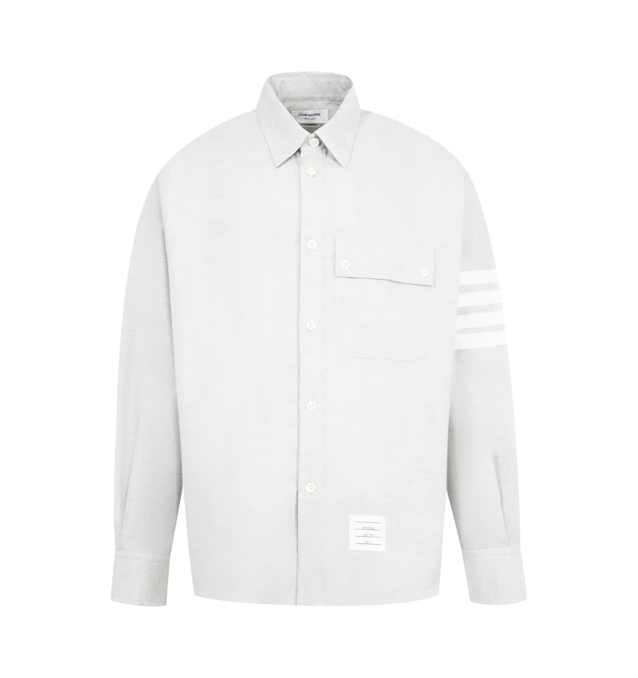 THOM BROWNE Woven Flannel Shirt featuring an oversized, roomy fit, front button closure, 4-bar detailing, buttoned front chest pocket, pleated back yoke with locker loop and signature striped grosgrain loop tab. 100% cotton. Made in Italy. DESIGNER STYLE ID: MWL420A-F0325 COLOR: 035 MED GREY