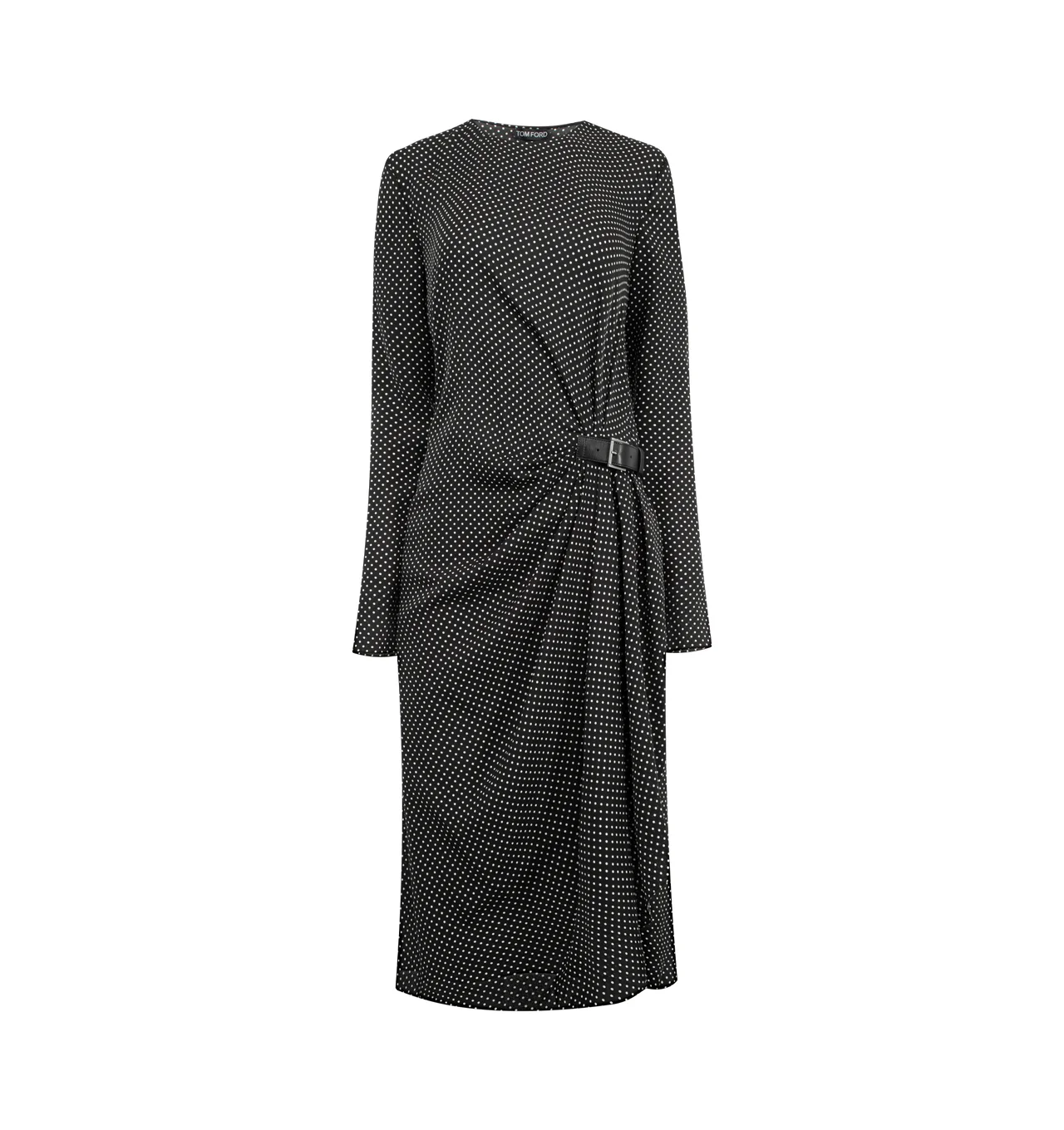 TOM FORDfeaturing silk sable long-sleeve dress with a draped leather-accented front, long sleeves and TF metal buckle. 100% silk. DESIGNER STYLE ID: AB3644-FAP253 COLOR: NWG BLACK/OFF WHITE