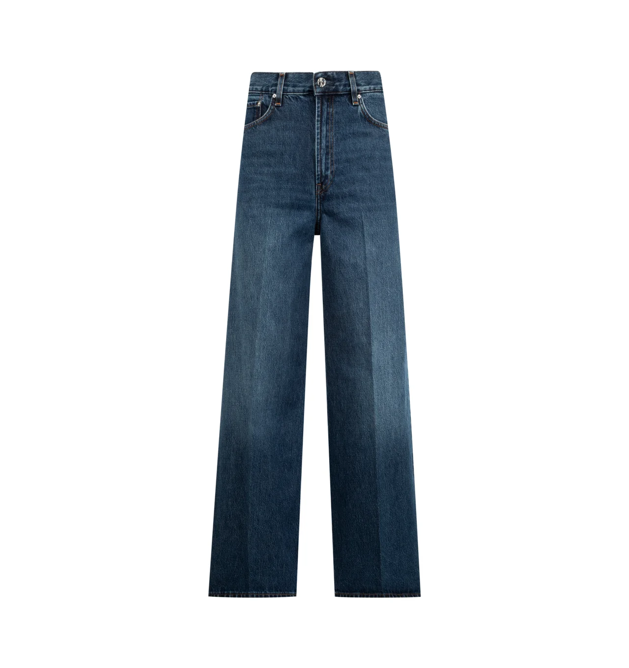 TOTEME Wide Leg Denim featuring high waistline and long, wide legs that are press-creased, belt loops, five pockets and zipper fly. 100% cotton organic. Made in Italy. DESIGNER STYLE ID: 242-WRB2426-FB0045 COLOR: 067 DK BLUE
