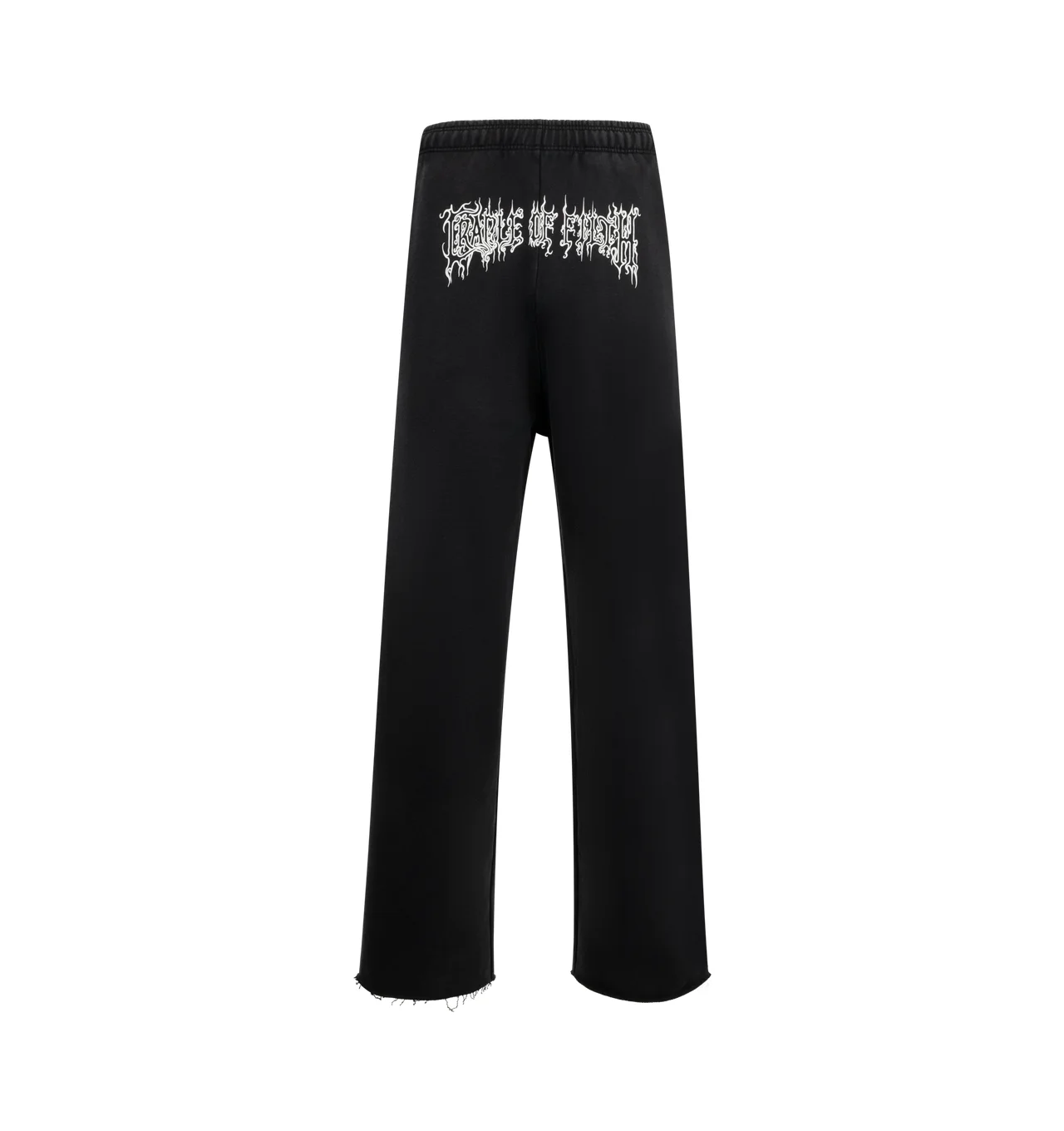 VETEMENTS Cradle of Filth Logo Baggy Sweatpants featuring elasticized waistband, three-pocket styling, text printed at front and relaxed fit. 80% cotton, 20% polyester. Made in Portugal. DESIGNER STYLE ID: UCF76SP100B COLOR: WASHED BALCK