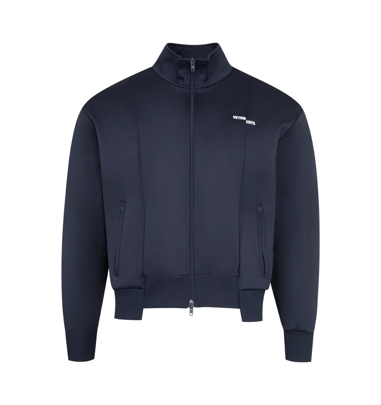 VETEMENTS Cut-Up Athletic Zip-Up Track Jacket featuring paneled construction, rib-knit stand collar, hem, and cuffs, zip closure, logo embroidered at chest and back collar, zip pockets at front and full stretch jersey lining. 56% polyamide, 44% cotton. Lining: 93% cotton, 7% elastane. Made in Portugal. DESIGNER STYLE ID: ME76GJ129N COLOR: NAVY