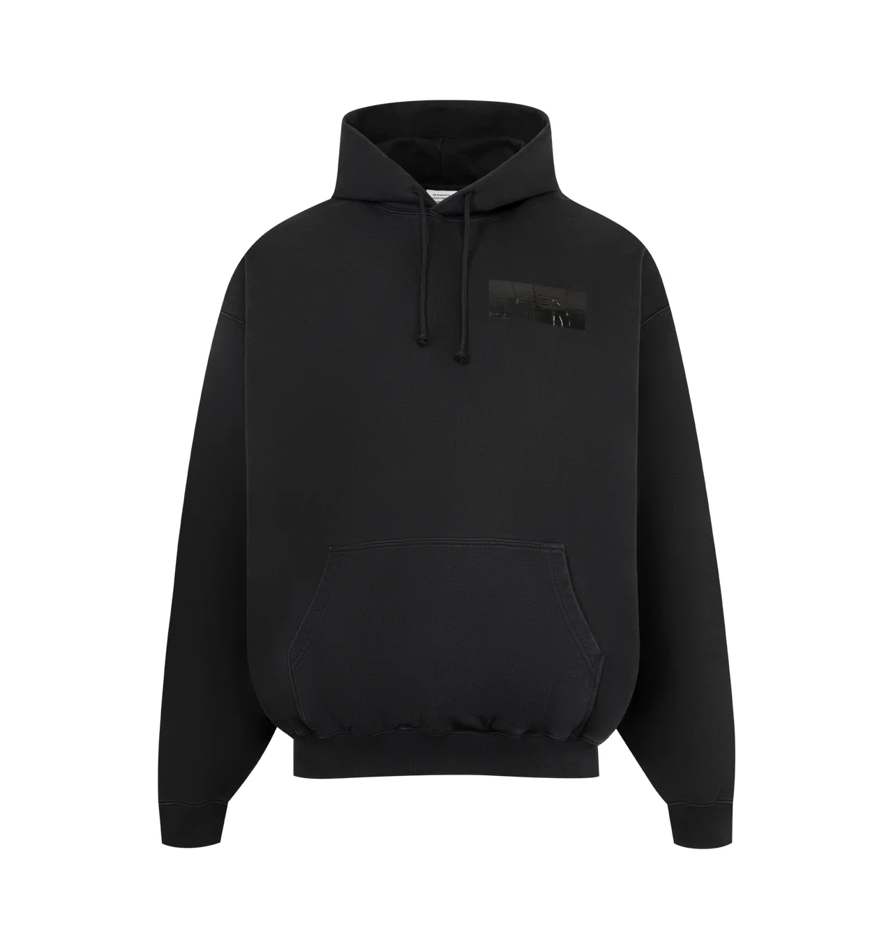 VETEMENTS Taped Logo Hoodie featuring french terry hoodie, drawstring at hood, tape applique with logo at hood and chest, kangaroo pocket at front, rib-knit hem and cuffs and dropped shoulders. 80% cotton, 20% polyester. Made in Portugal. DESIGNER STYLE ID: ME76HD147B COLOR: BLACK