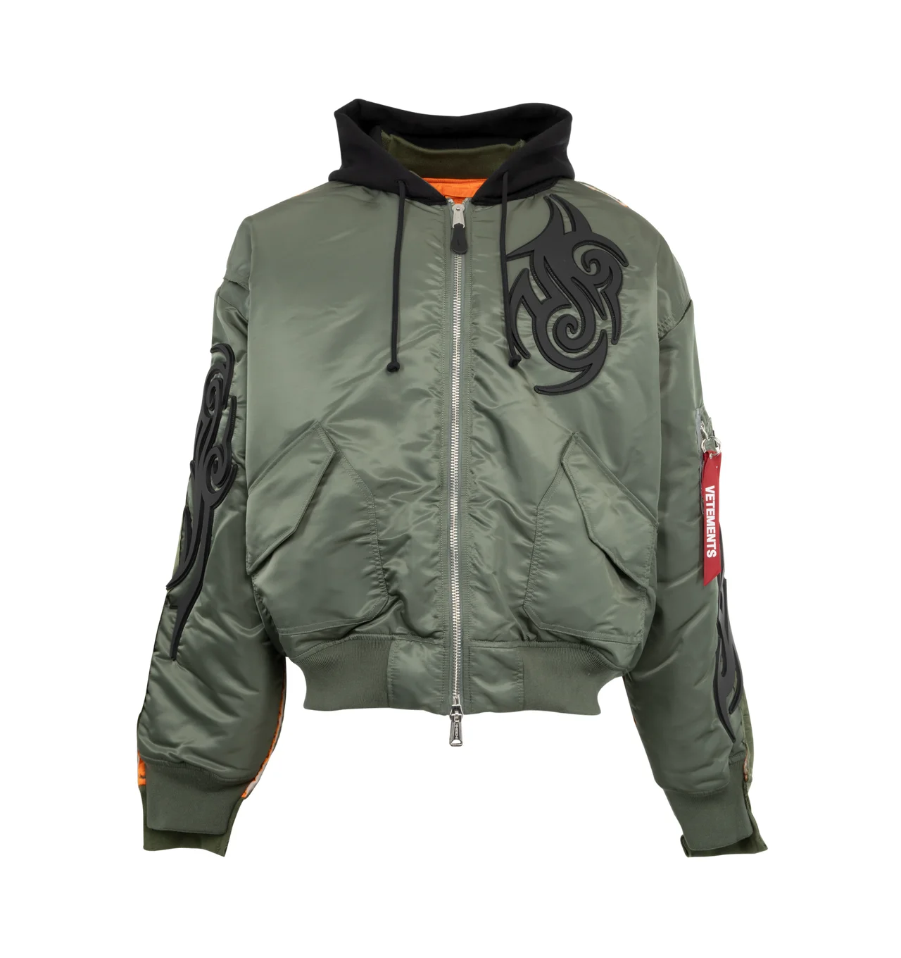 VETEMENTS Tribal Reworked Bomber jacket featuring front zip closure, drawstring hood, ribbed cuffs and hem, front pockets with flap and patch designs throughout. DESIGNER STYLE ID: UH76B0890GG COLOR: GREEN/BLACK