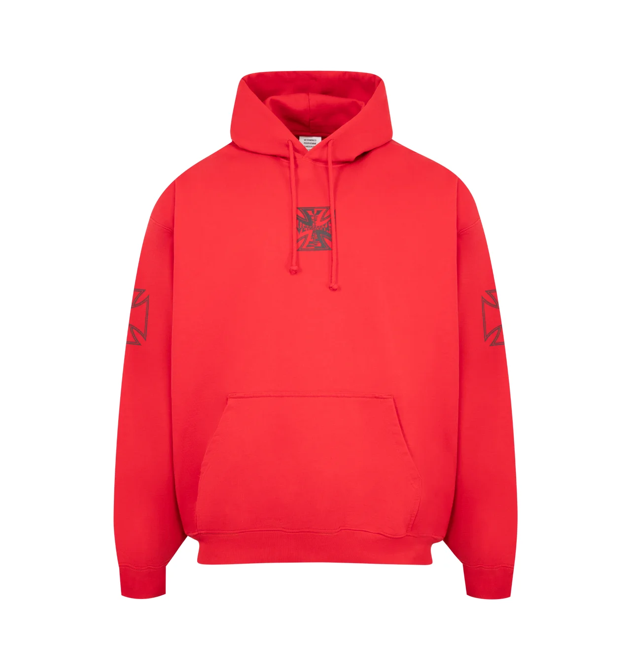 VETEMENTS Tripple Biker Cross Logo Hoodie featuring cotton-blend French terry hoodie, embroidered logo and drawstring at hood, logo graphic printed at chest, kangaroo pocket at front, rib-knit hem and cuffs, dropped shoulders and graphic printed at sleeves. 80% cotton, 20% polyester. Made in Portugal. DESIGNER STYLE ID: ME76HD164R COLOR: RED