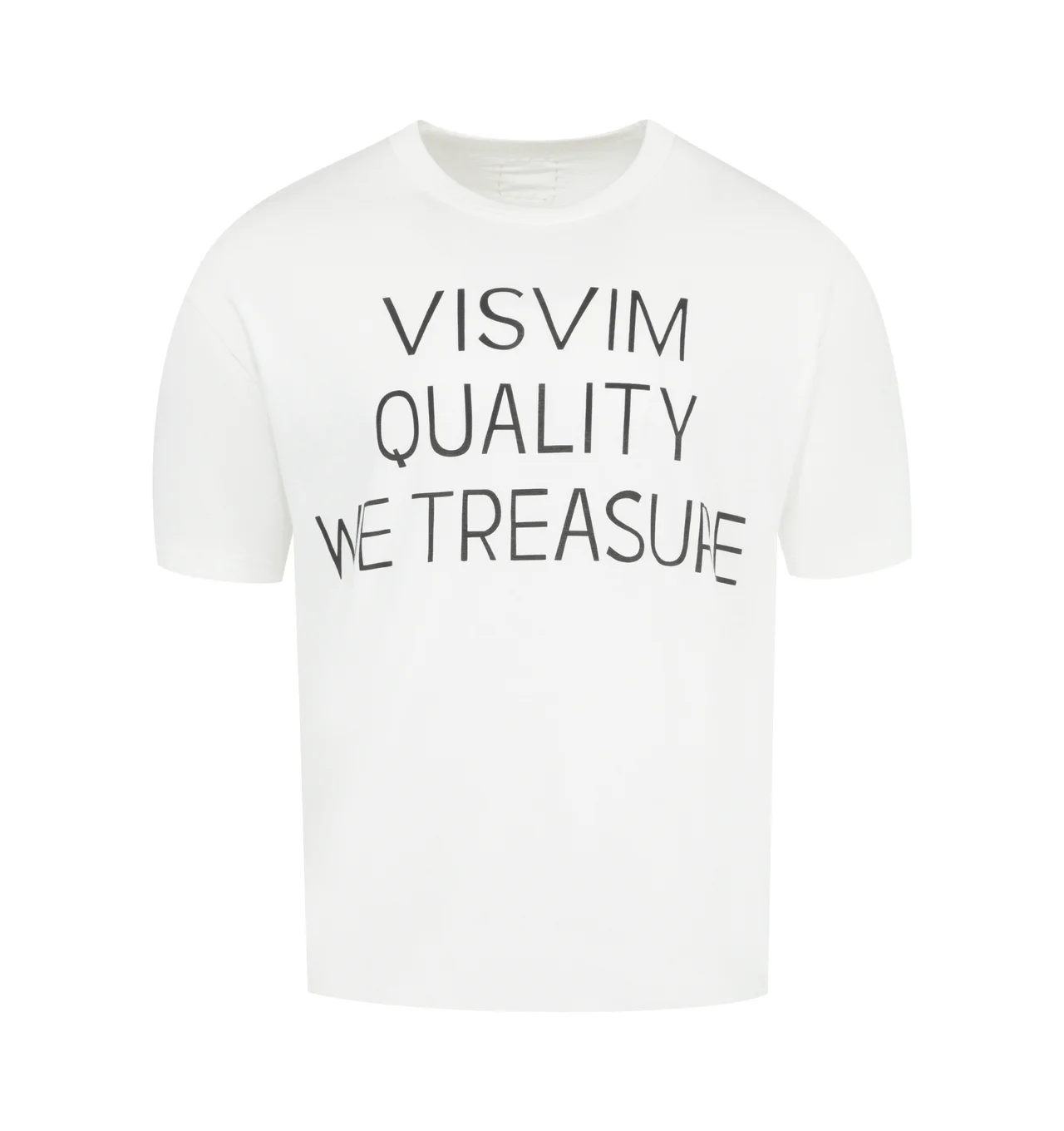 VISVIM Cotton Crewneck Short Sleeve T-Shirt featuring jumbo silhouette and "VISVIM QUALITY WE TREASURE" Print Detail. 100% Cotton with one wash. DESIGNER STYLE ID: 0125205010016 COLOR: WHITE