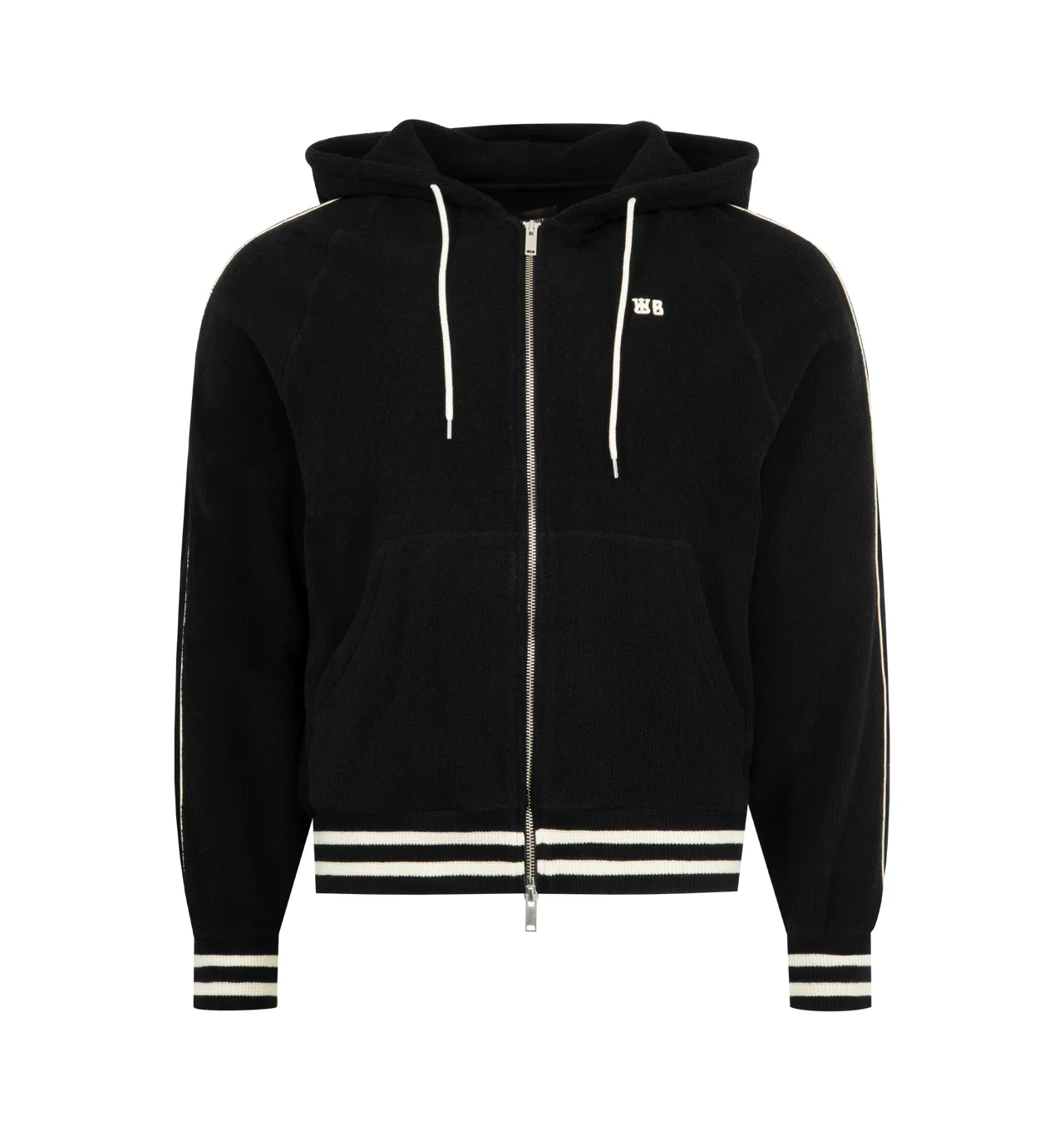 WALES BONNER Prince Hoodie featuring ribbed cotton-blend terry, striped details and monogram embroidery on the front, two-way zipped closure, drawstring hood and slant pockets. 88% cotton, 12% polyamide. Made in Portugal. DESIGNER STYLE ID: US26JE02-JE04-999 COLOR: BLACK