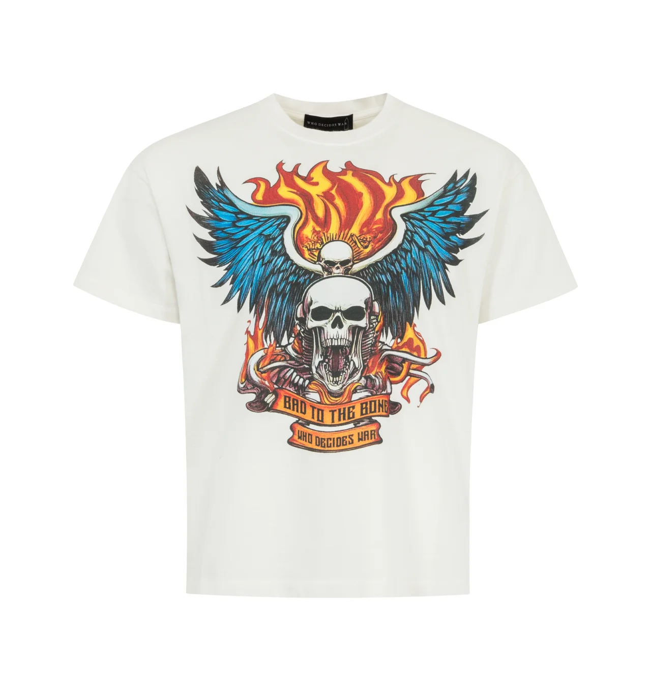 WHO DECIDES WAR Bad To The Bone Jersey Tee featuring short sleeves, original artwork applied by screen print, boxy and slightly cropped fit. 100% cotton. DESIGNER STYLE ID: 1110080001FW25 COLOR: CLOUD