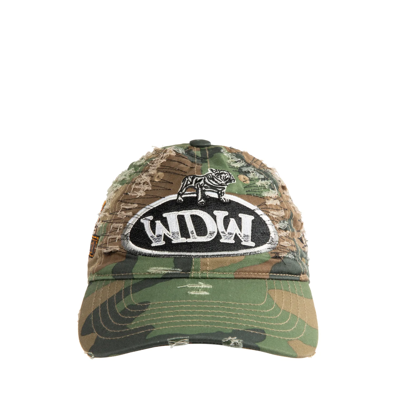 WHO DECIDES WAR Dale Cap featuring embroidered artworks, adjustable strap back and distressing. 100% cotton. DESIGNER STYLE ID: 1341450011FW25 COLOR: OLIVE/MULTI