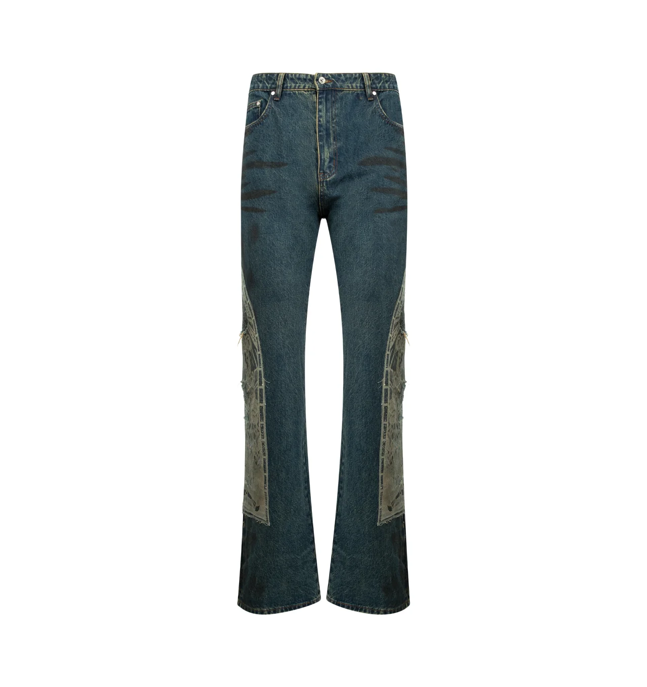 WHO DECIDES WAR Mechanic Signature Jeans featuring non-stretch denim jeans, fading, whiskering, and discoloration throughout, belt loops, five-pocket styling, zip fly, eEmbroidered logo applique with raw edges at outseams, logo patch at back waistband and logo-engraved silver-tone hardware. 100% cotton. DESIGNER STYLE ID: 1120900009FW25 COLOR: DENIM