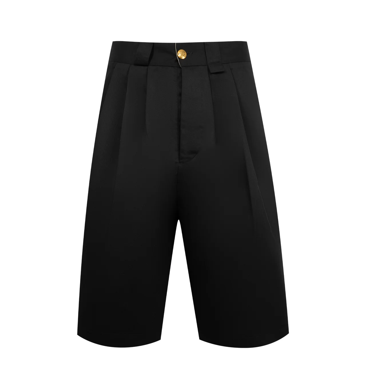 WILLY CHAVARRIA Borracho Pleated-Waist Cotton Blend Shorts featuring button-fly fastening at front, wide leg, structured waist, belt loops, pleated waist, two slip pockets at front, one welt pocket at back, one buttoned flap pocket a back and embroidered brand patch at back. 65% polyester, 35% cotton. Lining 100% cotton. Made in Italy. DESIGNER STYLE ID: WCBTM0053 COLOR: 001 BLACK