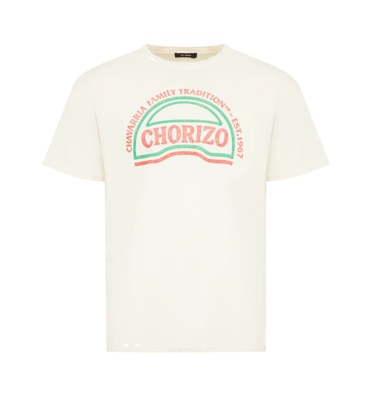 WILLY CHAVARRIA Chorizo Tee featuring a relaxed, effortlessly worn fit, subtle distressed holes at the collar, sleeves, and along the lower hem, a vintage-style CHORIZO graphic at the chest, short sleeves and crewneck. 100% cotton. DESIGNER STYLE ID: WCJSY0198-065 COLOR: MASA