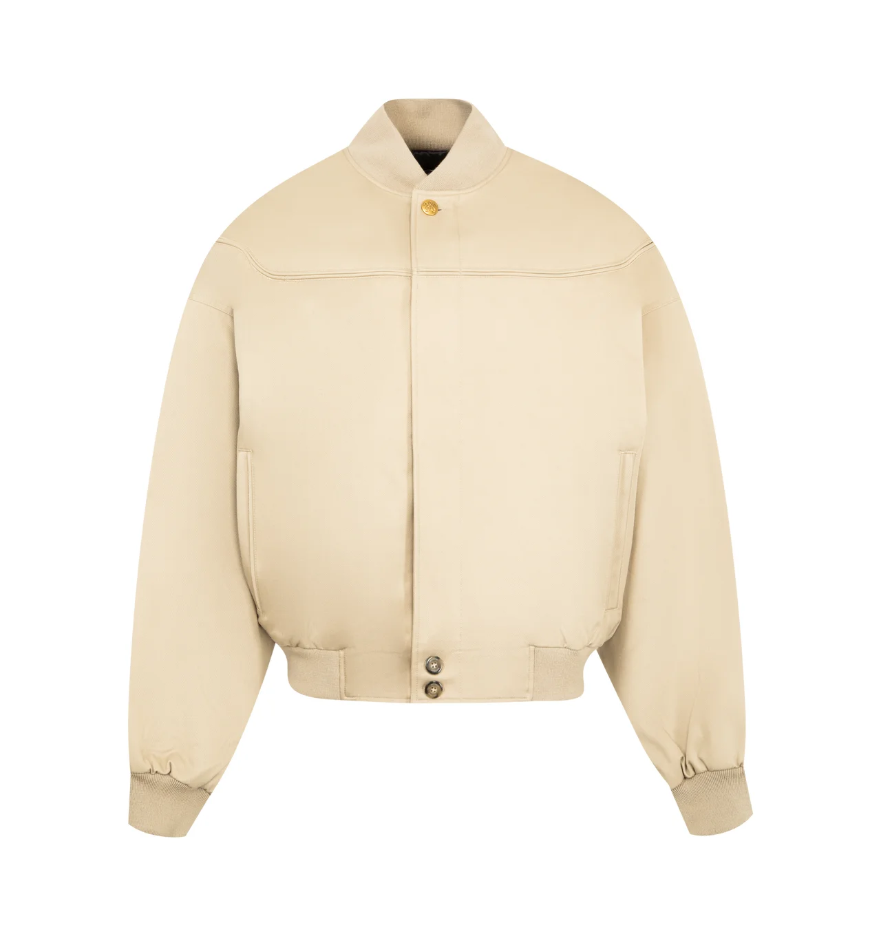 WILLY CHAVARRIA Gas Station Oversized Cotton Blend Bomber Jacket featuring concealed zip fastening at front, flat collar, long sleeves, two welt pockets at front, all-over binding detailing, branded hardware, ribbed trims and all-over internal padding. 65% polyester, 35% cotton. Lining 100% viscose. Made in Italy. DESIGNER STYLE ID: WC0UT0008 COLOR: 019 TRAVERTINE