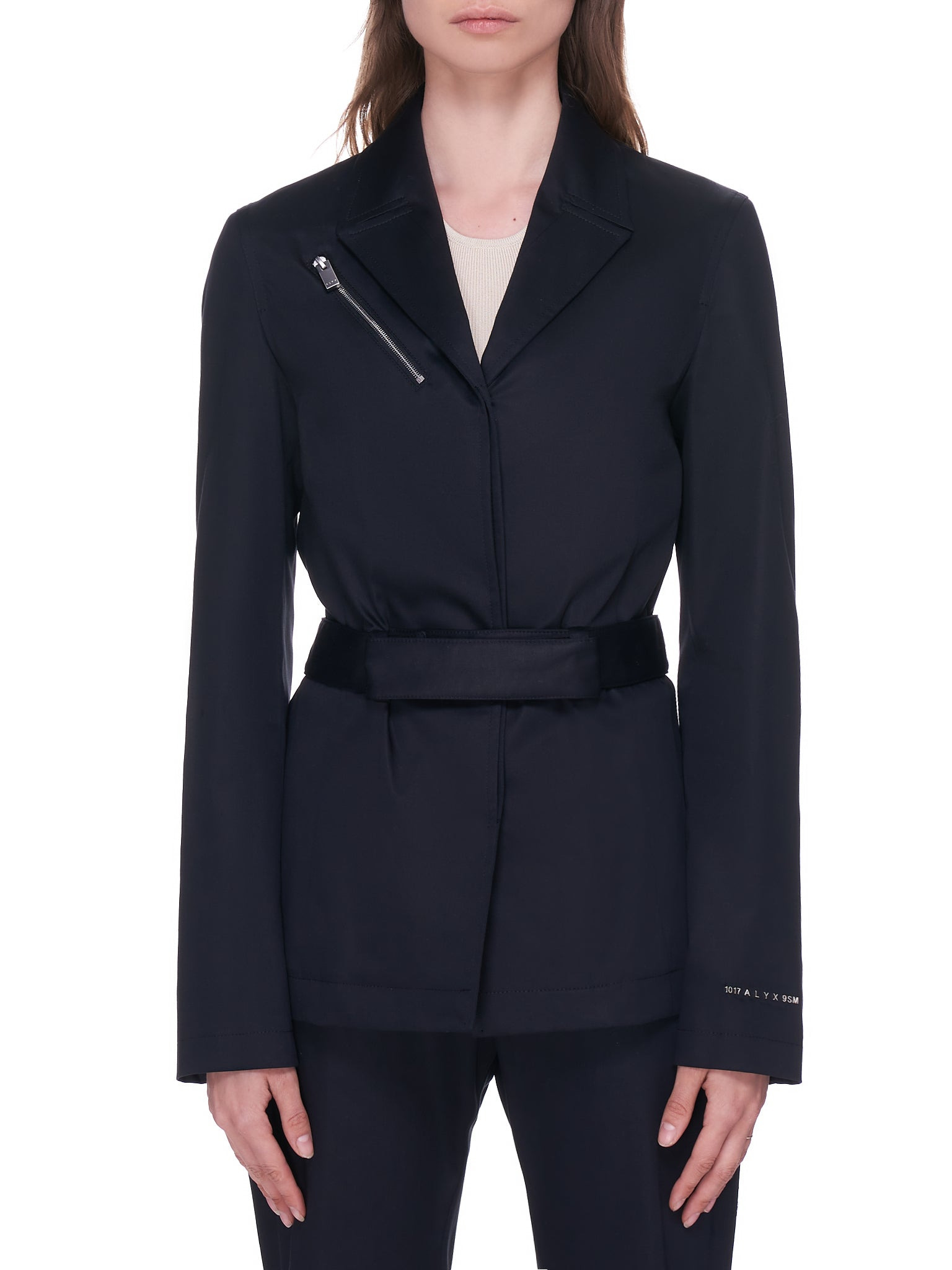 1017 Alyx 9SM blazer in black, notched lapel, tonal front button closure, zippered pocket under right lapel, long sleeves, metallic branded tab on left cuff, attached belt at waist with loops and adjustable snap button closure, interior pocketing, straight/finished hem, tonal stitching. Made in Italy. Standard XS-L sizing. Composition - 60% Cotton, 37% Lyocell, 3% Elastane. Model Measurements: Model is 5ft 8” and wearing a size XS. Bust: 32” Waist: 26” Hip: 36"