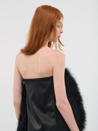 16ARLINGTON dress in black, feather overlay, strapless, internal corset, side seam pockets & zip closure, hook & eye fastening, fully lined, mini length, slim fit. UK Sizing 100% Polyester Model is 5'9" wearing size 8. Bust: 31.5" Waist: 23" Hips: 34"