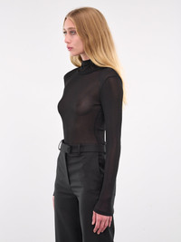 16ARLINGTON top in black, acetate-nylon blend, paneled construction, semi-sheer, mock neck, long sleeves, straight hem, form fit. Made in Portugal 80% Acetate 20% Polyamide UK Sizing Model is 5'8" wearing size 8. Bust: 31" Waist: 23.5" Hips: 34"
