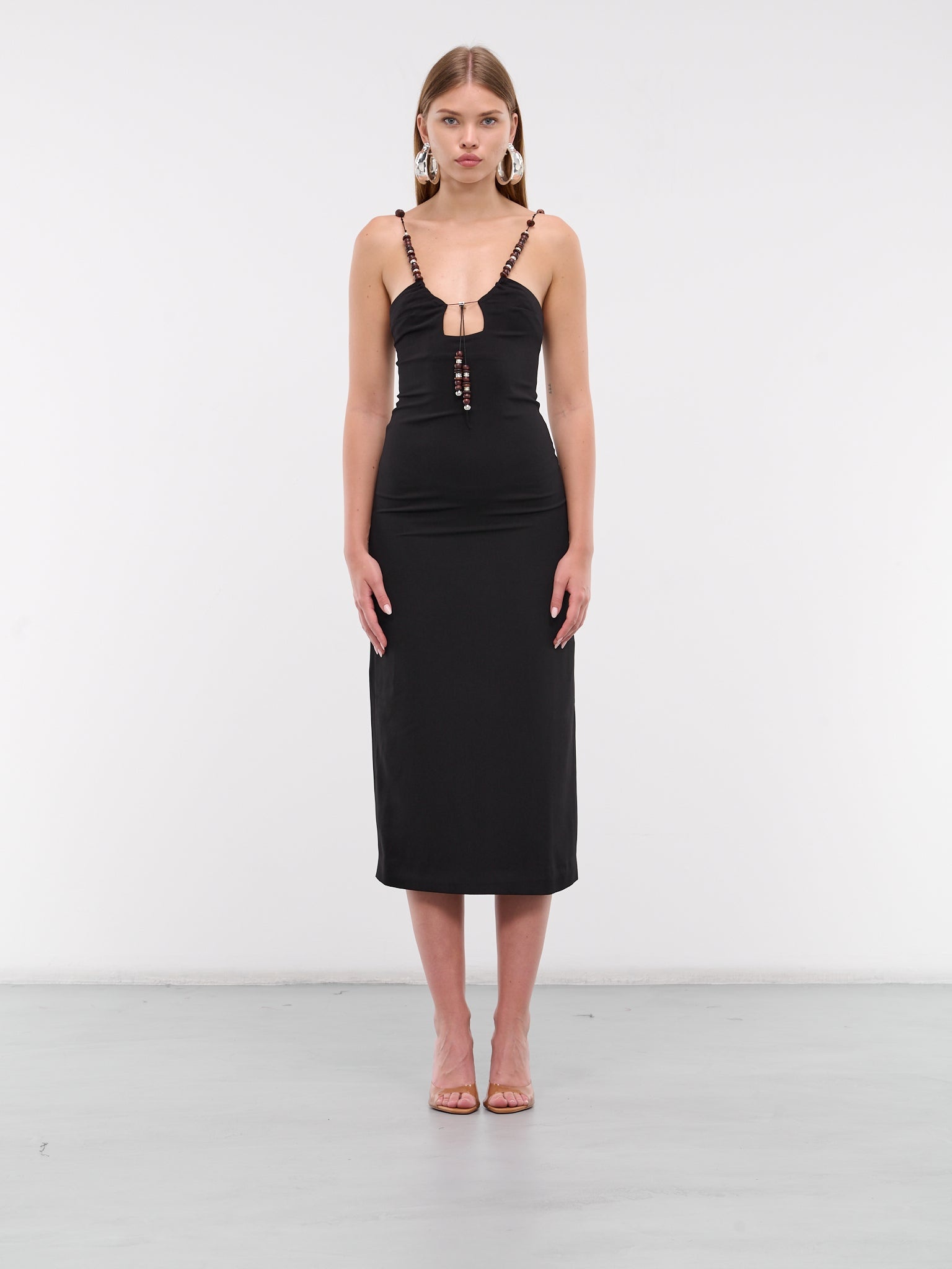 16ARLINGTON dress in black, paneled crepe construction, scoop neck, spaghetti straps, sleeveless, armscyes, front cut-out & beads, back concealed zip closure, back vent, straight hem, midi length, slim fit. Outer: 100% Polyester Inner: 100% Polyester UK Sizing Model is 5'10" wearing size 6. Bust: 33" Waist: 23.5" Hips: 35.5"