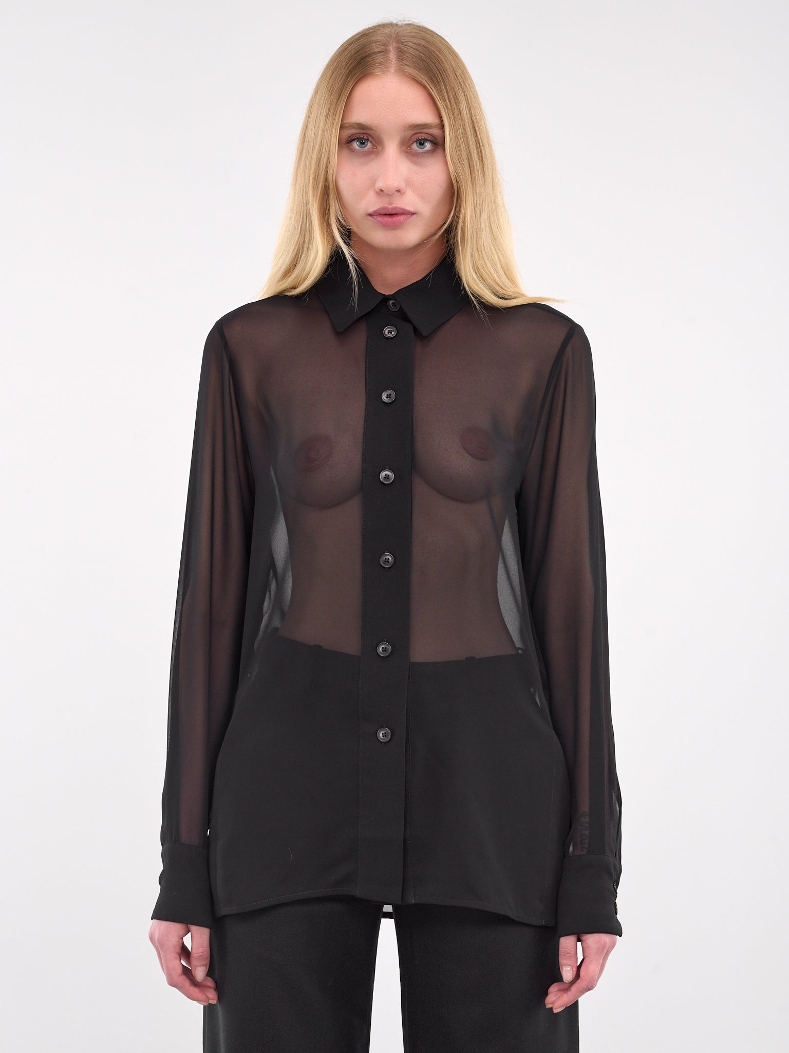 16ARLINGTON shirt in black, paneled poly construction, sheer, spread collar, front button placket closure, long sleeves, button cuffs, straight hem, relaxed fit. Made in UK 100% Polyester UK Sizing Model is 5'8" wearing size 8. Bust: 31" Waist: 23.5" Hips: 34"