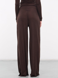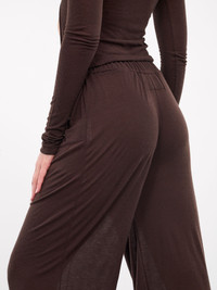 16ARLINGTON pants in brown, viscose-wool blend, paneled jersey construction, semi-sheer, partially elasticated waist, concealed zip fly closure, wide leg, relaxed fit. Outer: 70% Viscose 30% Wool Trim: 100% Leather UK Sizing Model is 5'10" wearing size 8. Bust: 33" Waist: 23.5" Hips: 35.5"