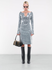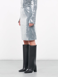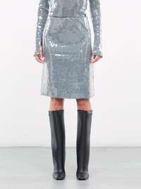 16ARLINGTON blue skirt, sequined stretch nylon construction, all-over sequins, mid-rise, back concealed zip closure, back vent, straight hem, lined, above-knee length, slim fit. Imported Outer: 95% Polyamide 5% Elastane Inner: 100% Polyester UK Sizing Model is 5'9" wearing size 6. Bust: 32" Waist: 24" Hips: 34"