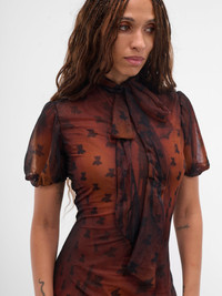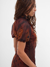 Rust brown short-sleeve dress in sheer nylon with a bow construction and seasonal printed pattern, finished with gathered sleeves and an invisible back zip. Featuring: • Regular fit • Below-knee length • Sheer nylon construction with seasonal print • Bow construction at front • Gathered short sleeves with cuff and shoulder gathers • Invisible center back zip • Main: 100% Nylon | Lining: 80% Nylon 20% Elastane • Standard sizing Model is 5'8" wearing size S. Bust: 33” Waist: 25.5” Hips: 34”