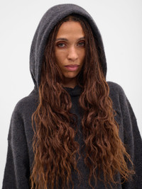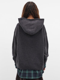 Gray hooded knit sweater in yak, wool and alpaca blend with layered flannel shirting details at the hem and cuffs. Featuring: • Relaxed fit • Below-hip length • Yak, wool and alpaca blend construction • Hooded neckline • Dropped shoulders • Flannel shirting contrast panels at hem and cuffs • Main: 31% Yak Wool 31% Alpaca 22% Nylon 16% Wool | Contrast: 100% Cotton • Standard sizing Model is 5'8" wearing size S. Bust: 33” Waist: 25.5” Hips: 34”