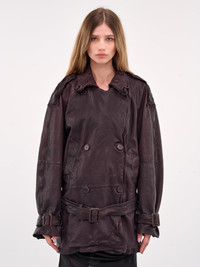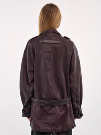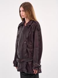 ACNE STUDIOS jacket in dark brown, paneled leather construction, wrinkled leather effect, spread collar, front double-breasted button closure, shoulder epaulets, raglan long sleeves, cuff belt loops & adjustable pin-buckle strap, back strap & logo embossing, side welt pockets, waist belt loops & adjustable pin-buckle belt, straight hem, relaxed fit. French Sizing Model is 5'9" wearing size 36. Bust: 32" Waist: 23" Hips: 34"