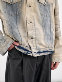 ACNE STUDIOS jacket in light blue, paneled denim construction, light wash, dirtied effect, fading & whiskering, spread collar, front button placket closure, long sleeves, button cuffs, chest buttoned flap pockets, hem adjustable button straps, straight hem, lined, oversized fit. 100% Cotton Italian Sizing Model is 6'1” and wears a size 48. Shoulders: 17” Chest: 33” Waist: 30”