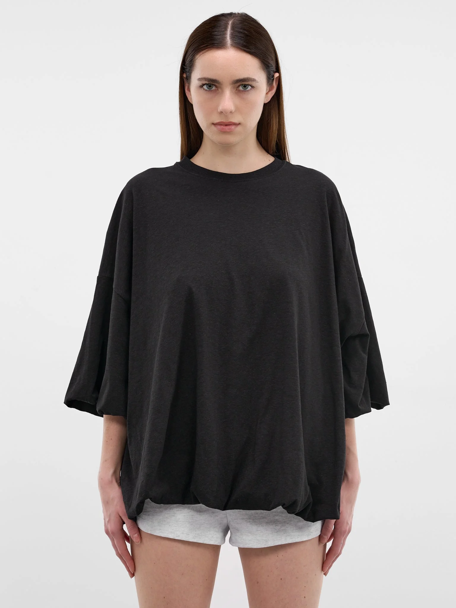 T-shirt in black constructed from organic cotton jersey with gathered sleeve and hem detailing. Featuring: • Relaxed fit • Cotton jersey construction • Irregular texture • Crewneck • Short sleeves • Voluminous gathering at sleeves and hem • Dropped shoulders • Below-hip length • Large seasonal logo label at back • Shell: 85% Cotton 15% True Hemp • Standard sizing Model is 5'8" wearing size S. Bust: 32” Waist: 25” Hips: 35”