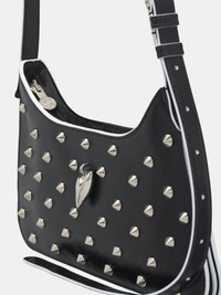 ACNE STUDIOS bag in black, paneled leather construction, metal studs throughout, silver-tone hardware, adjustable shoulder strap, pin-buckle, top zip closure, heart-shaped charm, buttoned slot, removable mirror, lined, dustbag included. Outer: 100% Calf Leather Inner: 50% Polyurethane 50% Polyester One Size