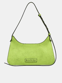 ACNE STUDIOS bag in green, rectangle design, suede leather, cracked smooth finish, tonal logo patch, adjustable shoulder strap, folded base & sides, zip closure, detachable mirror, silver-toned hardware, fully lined, dust bag included. Made in Italy French Sizing Shell - 100% Leather Lining - 50% Nylon, 50% Polyurethane 12" x 7" x 1" 11" Total Strap Length