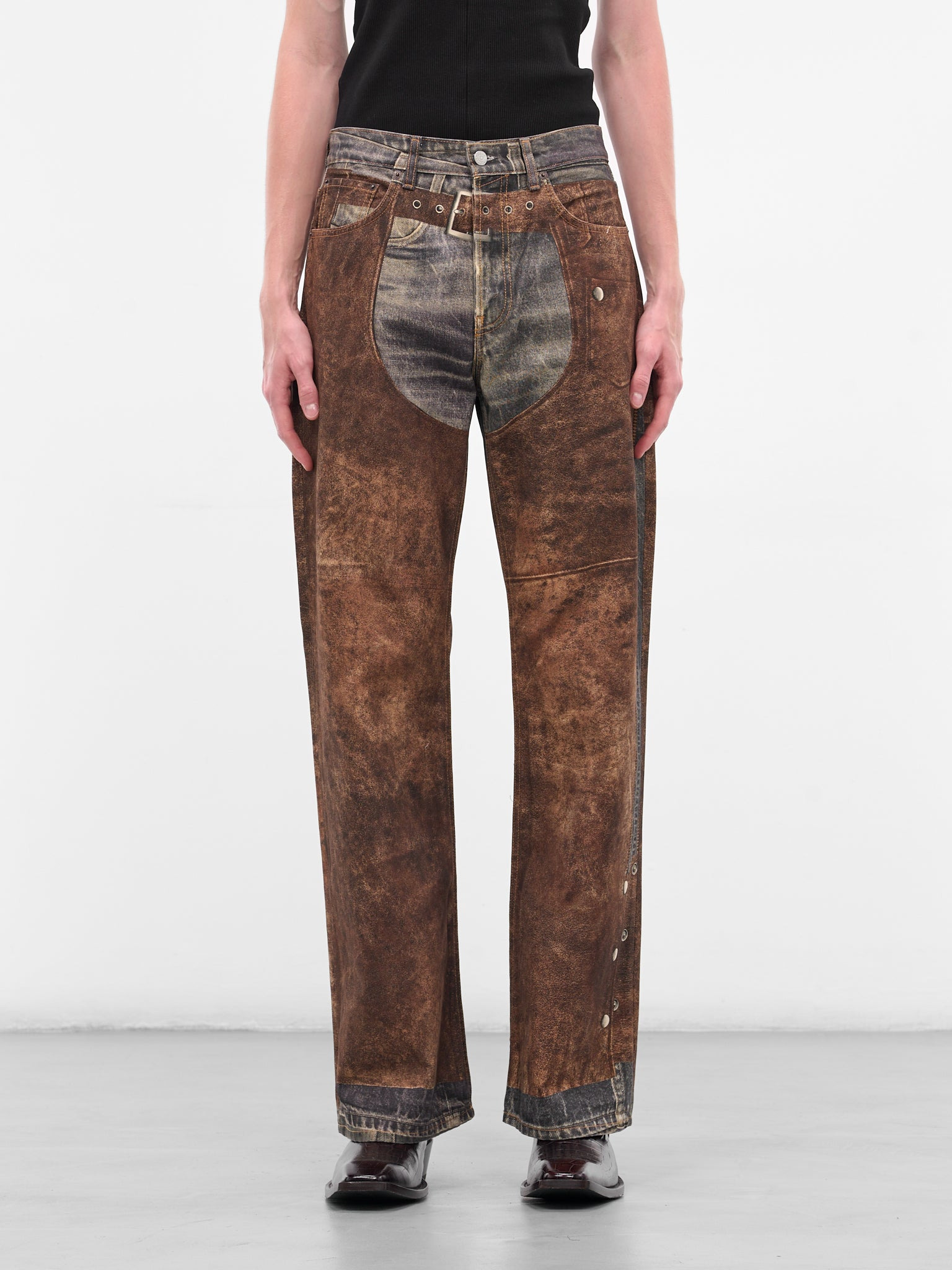 Blue and brown jeans in organic cotton canvas with a brushed finish and trompe l’œil chaps print. Featuring: • Regular fit • Mid waist • Wide straight leg with subtle flare • Canvas construction • Trompe l’œil chaps print • Five-pocket styling • Belt loops • Button fly closure • Main: 100% Cotton • Italian sizing Model is 6'3" wearing size 48. Shoulders: 18" Chest: 36" Waist: 28.5"