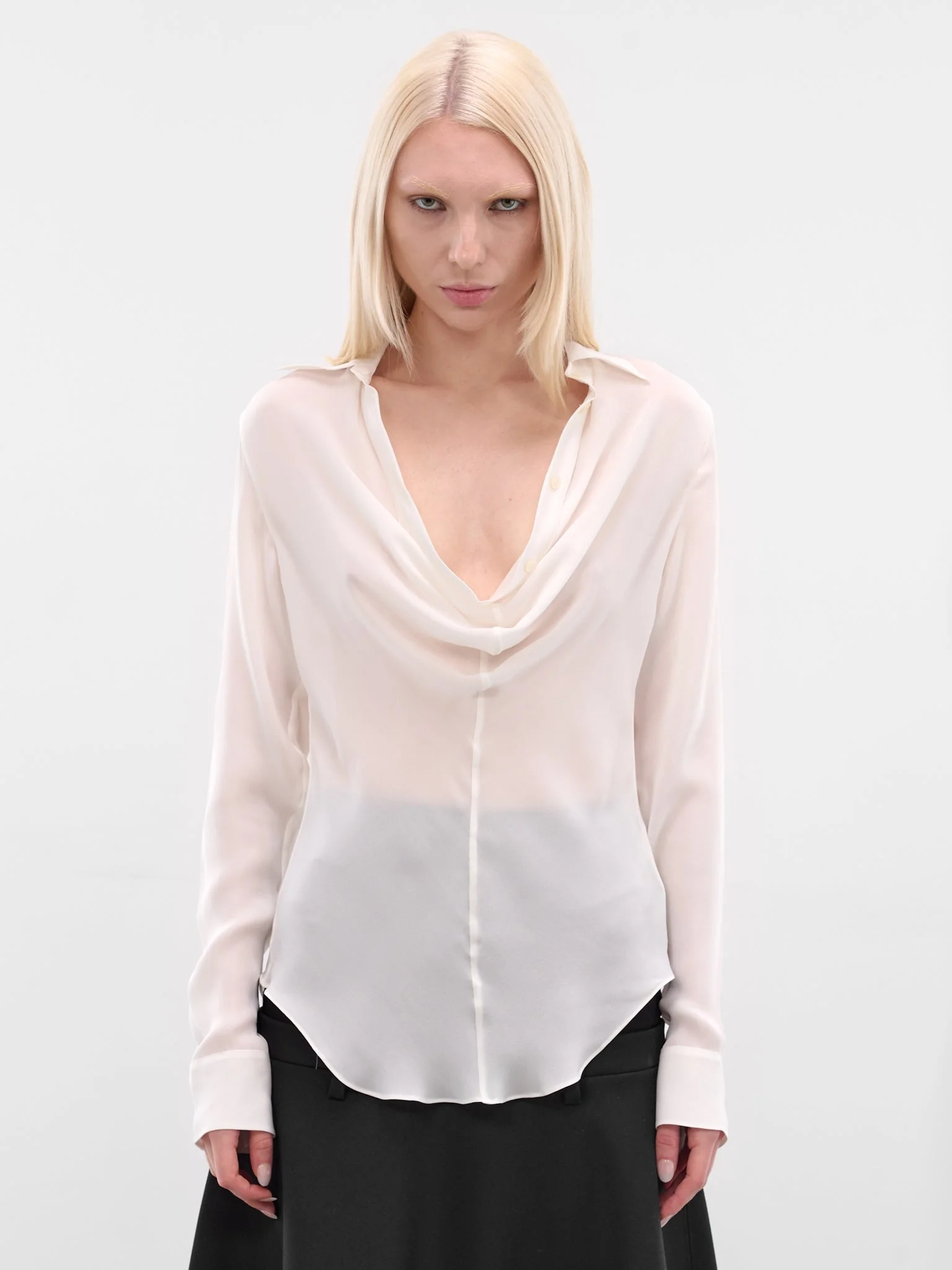 Featuring: • Regular fit • Silk construction • Semi-sheer • Below-hip length • Cowl neck and collar • Button details • Long sleeves • Snaps at the yoke • 100% Silk • French sizing Model is 5'9" wearing size 36. Bust: 32" Waist: 25" Hips: 34"