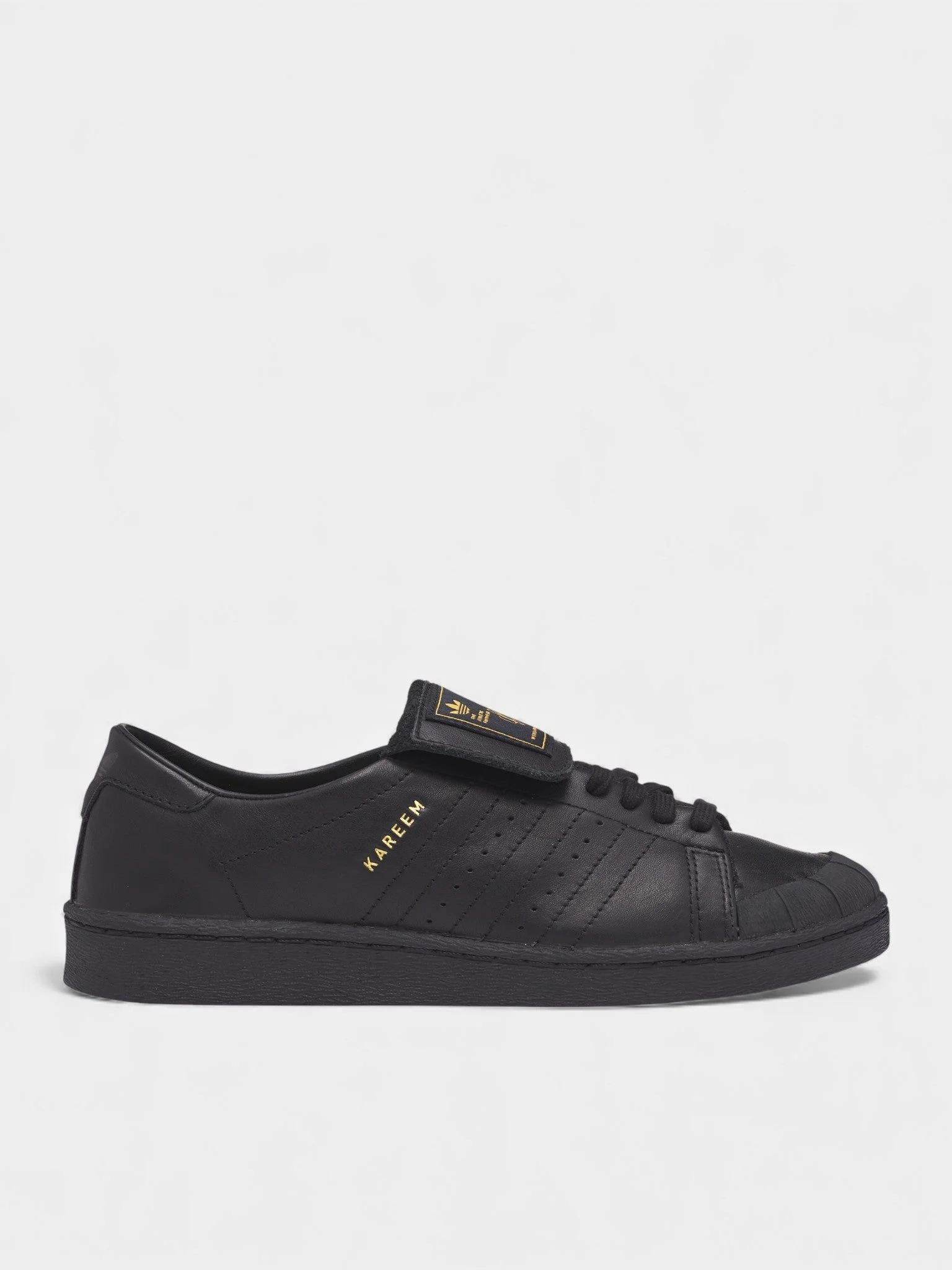 Low-top leather sneaker in black with three stripe motif, rubber cap toe, and collaboration branding at tongue and heel. Featuring: • Low-top silhouette • Leather construction • Three stripe motif • Lace-up fastening • Rubber cap toe • Collaboration branding at tongue and heel • Rubber sole • Willy Chavarria and Adidas collaboration • Made in Indonesia • Main: 100% Leather | Sole: 100% Rubber • Men's US sizing