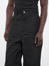 AIREI pants in black, paneled denim construction, raw hems, belt loops, back logo embroidery, front button & concealed zip fly closure, inset pockets, wide leg, baggy fit. Made in US 100% Cotton Standard Sizing Model is 5'11" wearing size M. Shoulders: 19" Chest: 38" Waist: 30"