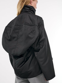ALAIN PAUL jacket in black, paneled nylon construction, high neck, front exposed two-way zip closure, dropped shoulders, long sleeves, side welt pockets, straight hem, oversized fit. Made in Italy Outer: 100% Polyamide Inner: 100% Viscose Standard Sizing Model is 5'8" wearing size S. Bust: 31" Waist: 23.5" Hips: 34"