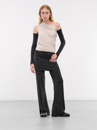 ALAIN PAUL leggings in black, paneled stretch cupro construction, draping throughout, fitted waist, pencil skirt overlay, straight leg, relaxed fit. Made in Portugal 94% Cupro 6% Elastane Standard Sizing Model is 5'8" wearing size S. Bust: 31" Waist: 23.5" Hips: 34"